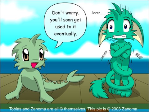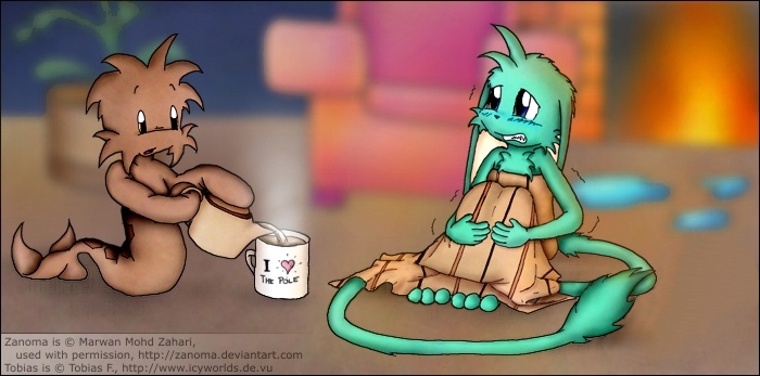 Meet Zanoma, a green fellow with huge ears and a long tail, paying Tobias a visit in his home world at the South Pole -- even though he's not quite comfortable with this cold environment yet, sooo ..