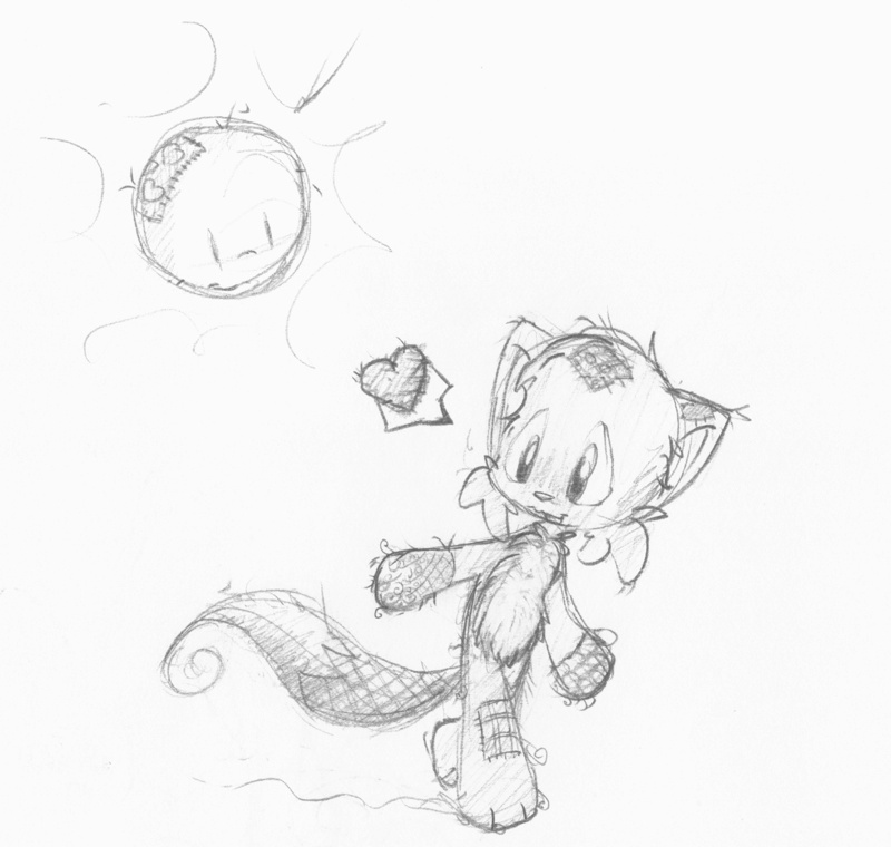 Eeeeee!!!!!!!!!! Oh, I love it!!!! *huggles* It's so cute and cuddly! I love all the curly threads coming off, and the different patterns on the patches. Especially the one on the sun. The shading is great and I think the white space just makes it look simpler, like it actually is a cute childs toy. That and the fact that there's a smilie sun. =D