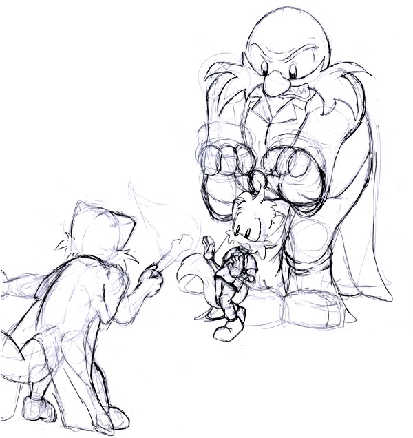 Cornered ! (by Tobias, Aug 28, 2003) Yay, a new character .. well actually no, I drew him about one year ago, but I didn't draw him recently .. but let me back up now, okay? .. Soo .. here we go .. meet Timmy, actually Timothy, medium rare. Oww .. okay, bad joke, I know. Don't ask me how he got into this situation, he doesn't even know himself .. sneaking around, exploring, encountering some evil looking fellow with a torch, running, getting cornered .. or something like that .. it all went way too fast. Jen is holding the torch here, very out of character I think, but since she already drew a picture I did not except coming from her at all, I thought I could do just the same. That huge guy in the background is Dr. Robotnik .. or Ivo, without googles (finally managed to give them to his many fangirls ^.^) .. I don't know, I'm near-sighted so I can't really tell you, and little Timmy doesn't even know that someone's standing behind him. Surprise, surprise, I know. Ivo and Jen are © Jenifer Irwin. Dr. Robotnik is © Sega / Sonic Team |